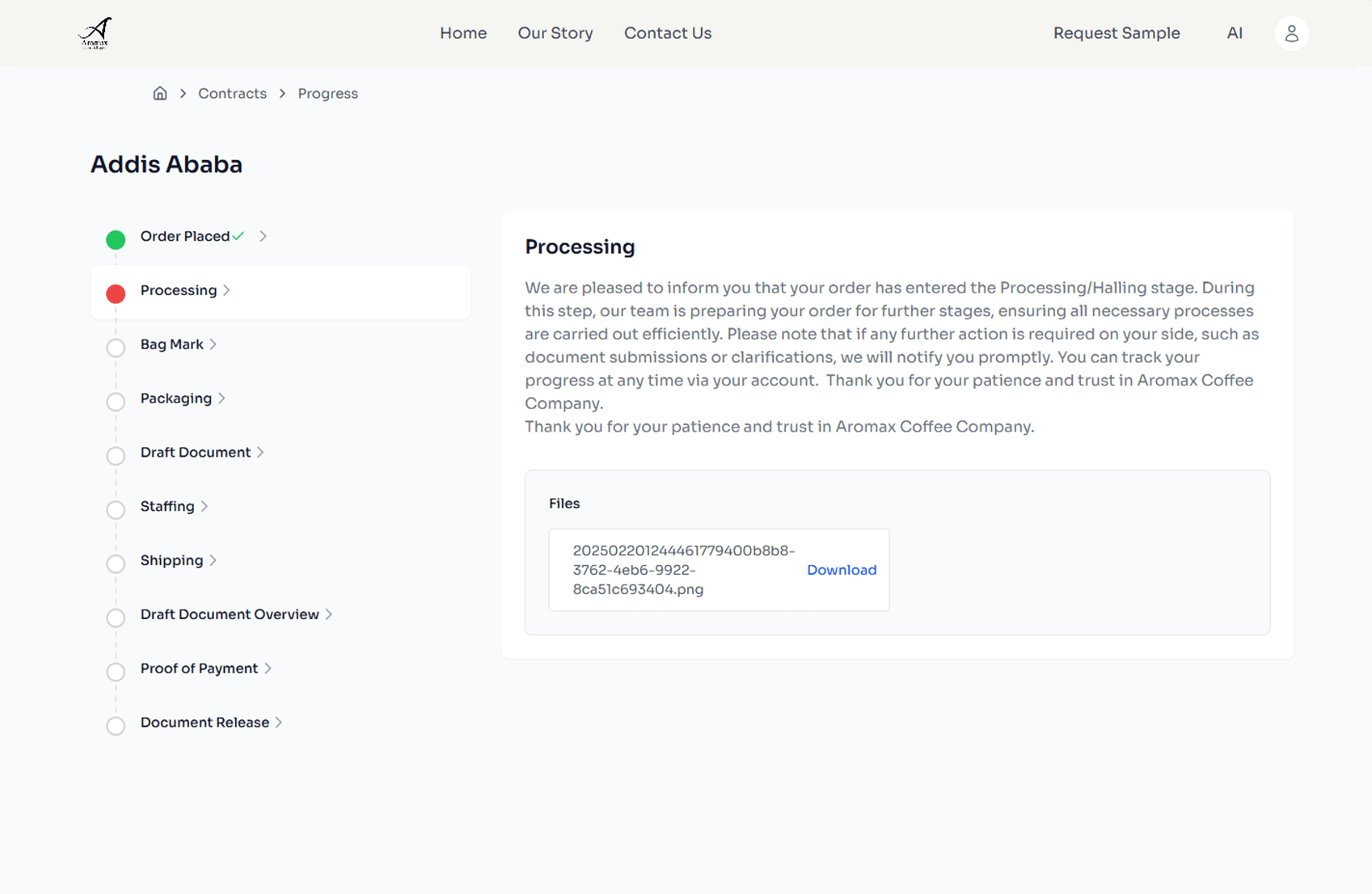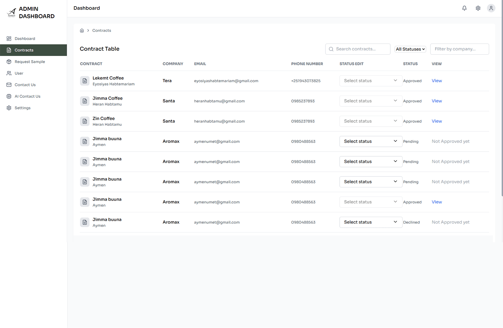 Aromax is a dynamic platform that connects coffee importers, distributors, and companies with top-tier coffee suppliers. Designed to streamline the entire process of establishing coffee contracts, Aromax allows users to request contracts or coffee samples with ease. The platform also enables users to track the progress of their contracts in real-time, ensuring complete transparency and efficiency. On the administrative side, managers have robust controls to manage all user contracts, update progress, upload relevant files, and approve new user sign-ups.